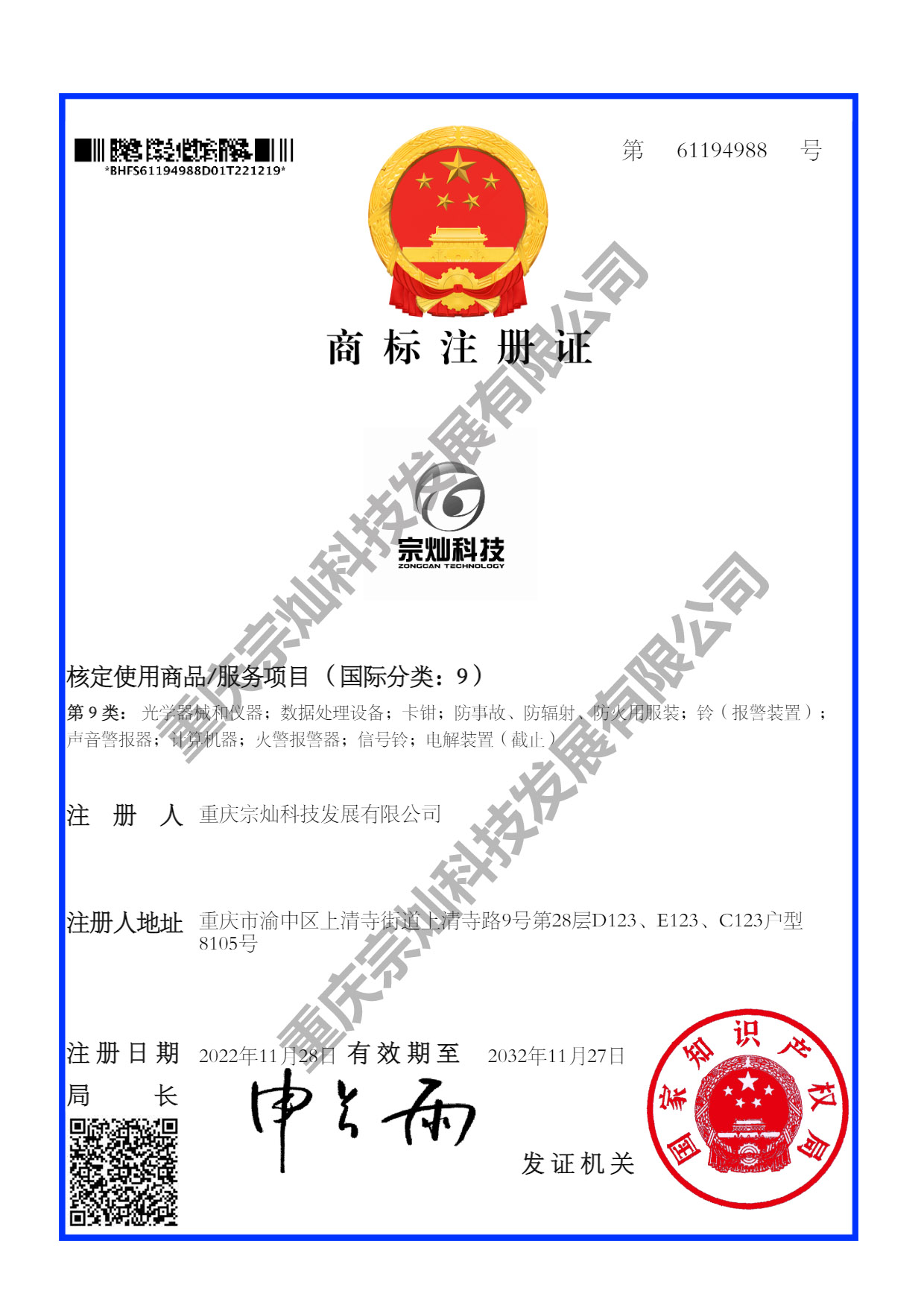 宗燦科技商標證書
